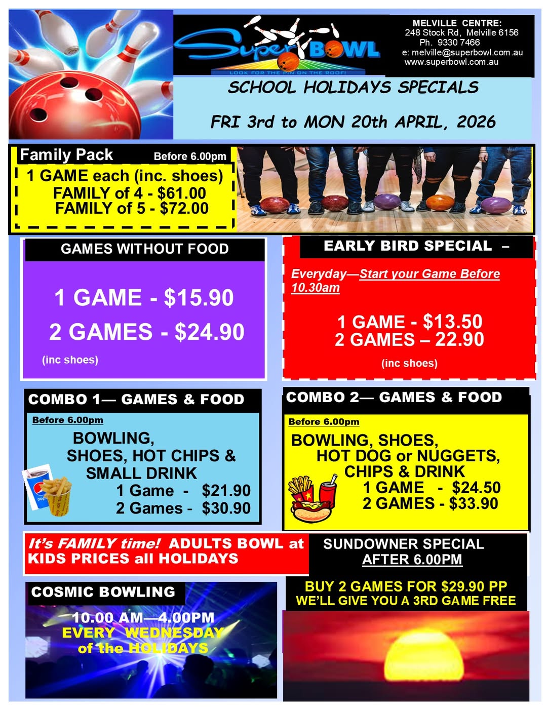 At Super Bowl Melville we have a licensed cafe offering a great range of snacks to complete meals. Enjoy your food and drinks in our centre or order take away to take home and share with family and friends. We also cater for functions and birthday parties from 10 to 180 people with a great variety of menu packages to choose from. Read more . . .
